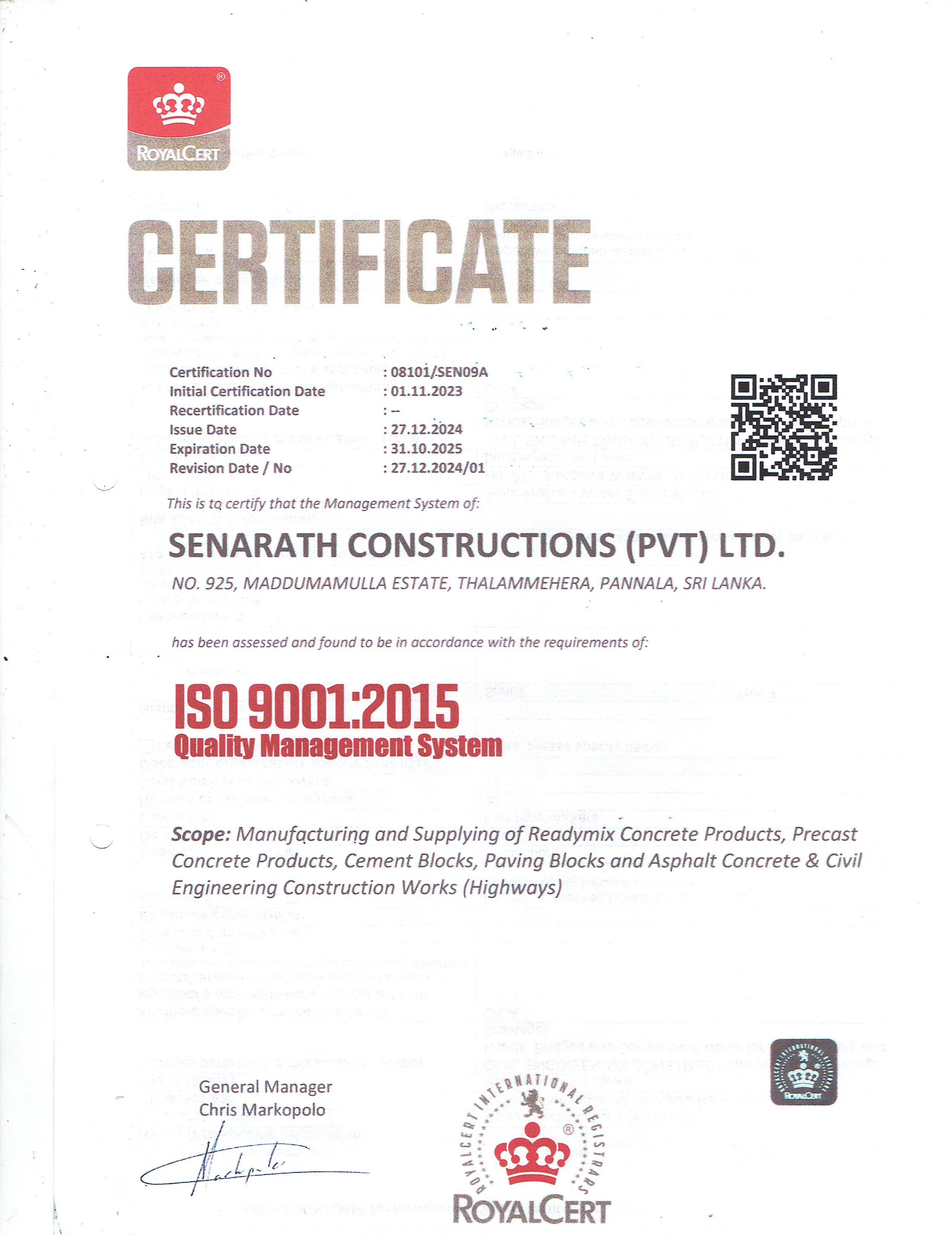 Senarath Constructions (Pvt) Ltd is proud to be ISO 9001:2015 certified for Quality Management Systems, reflecting our unwavering commitment to delivering excellence in construction. This certification demonstrates that our operations follow globally recognized standards of quality, efficiency, and customer satisfaction. With a strong focus on reliability, safety, and continuous improvement, we ensure that every project we undertake upholds the highest levels of professionalism and integrity. Our certification is not just a mark of compliance but a promise to our clients and stakeholders that we consistently strive to build with quality, trust, and long-term value.